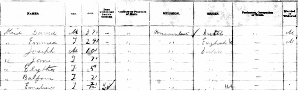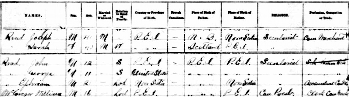 | Son | He was enumerated on the census in 1881 in the household of David Purrington Read, as a son, in Lot 19, Prince County, Prince Edward Island, CanadaG. Enumerated in the household with William were his wife Emeline (entered as Emiline), daughter Dorothy, sons David, Nelson and Edwin, and his aunt Ellen, who had helped raise him. Enumerated in the household with David (age 37) were his wife Emma Bishop (age 29), children Joseph (age 10), Jane (age 7), Elytha (age 5), Balfour (age 2) and Emeline (7 months). David Was a farmer. The family religion was Methodist.2 1881 Canada Census, Lot 19, Prince County, Prince Edward Island. Household of David Read, his wife Emma Bishop, children Joseph, Jane, Elytha, Balfour and Emeline. |