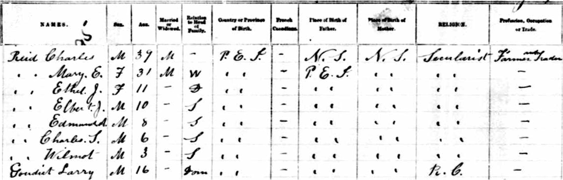 | Witness | He was enumerated on the census on 23 April 1891 in the household of Charles R. Read in Lot 19, Prince County, Prince Edward Island, CanadaG. included in the household with Charles (age 39) were his wife Mary Eva (age 31), their children Ethel (age 11), Elbert (age 10), Edmond/Edward (age 8), Charles (age 6) and Wilmot (age 3). There was also a domestic, age 16. Charles was a farmer and trader. The family religion was Secularist.3 1891 Canada Census, Lot 19, Prince County, Prince Edward Island. Household of Charles R. Read, his wife Mary Eva Burns, their children Ethel, Elbert, Edmond/Edward, Charles and Wilmot. |