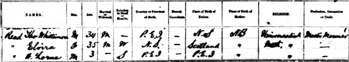 | Witness | Elvira Davidson was enumerated on the census on 15 April 1891 in the household of Thomas Whittemore Read in Summerside, Prince County, Prince Edward Island, CanadaG. included in the household with Thomas Whittemore (age 34) were his wife Elvira Davidson (age 35) and their only surviving child, Lorne (age 3) - three children had died young. His occupation was recorded as Master Mariner (ship's captain). The family religion was Universalist.4 1891 Canada Census, Summerside, Prince County, Prince Edward Island. Household of Thomas Whittemore Read, his wife Elvira Davidson and their son Lorne. |