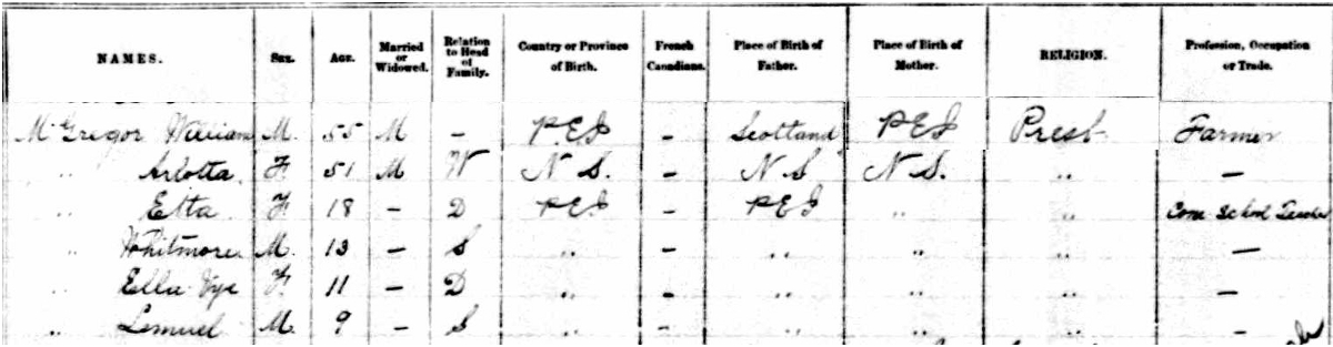 | Witness | He was enumerated on the census on 9 April 1891 in the household of William MacGregor in Lot 9, Prince County, Prince Edward Island, CanadaG. included in the household with William (age 55) were his wife Arlotta Read (age 51), their children Etta (age 18), Whitmore (age 13), Ella Violet (age 11), and Lemuel (age 9). William was a farmer, Etta was a school teacher. The family religion was Presbyterian. [Note: Arlotta's birthplace and that of her parents was incorrectly recorded as Nova Scotia. She was actually born in Prince Edward Island, her parents in New Brunswick.].2 1891 Canada Census, Lot 9, Prince County, Prince Edward Island. Household of William MacGregor, his wife Arlotta Read, their children Etta, Whitmore, Ella Violet and Lemuel. |