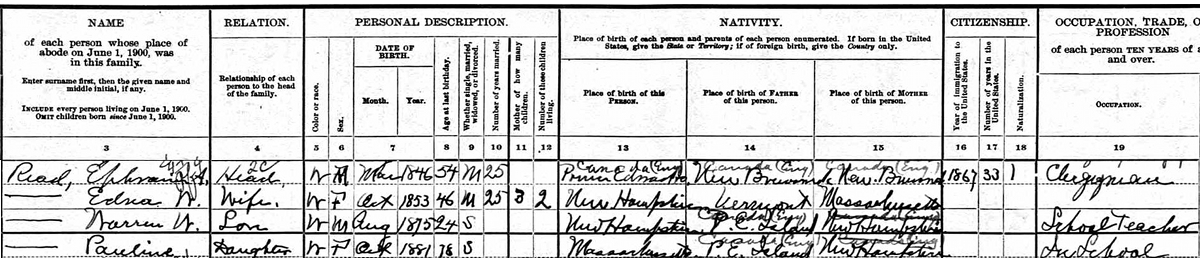 | Witness | Edward Read was enumerated on the census in 1901 in the household of Charles R. Read in Lot 9, Prince County, Prince Edward Island, CanadaG. included in the household with Charles (age 49) were his wife Mary Eva (age 41), their children Ethel (age 21), James/Elbert (age 19), Edmond/Edward (age 16), Charles (age 14), Wilmot (age 13) and Ephraim (age 3). Charles was a farmer, Ethel a teacher. James, Edmund and Charles were farmer's sons. The family religion was Universalist.2 1901 Canada Census, Lot 9, Prince County, Prince Edward Island. Household of Charles R. Read, his wife Mary Eva Burns, their children Ethel, Elbert/James, Edmond/Edward, Charles, Wilmot and Ephraim. |