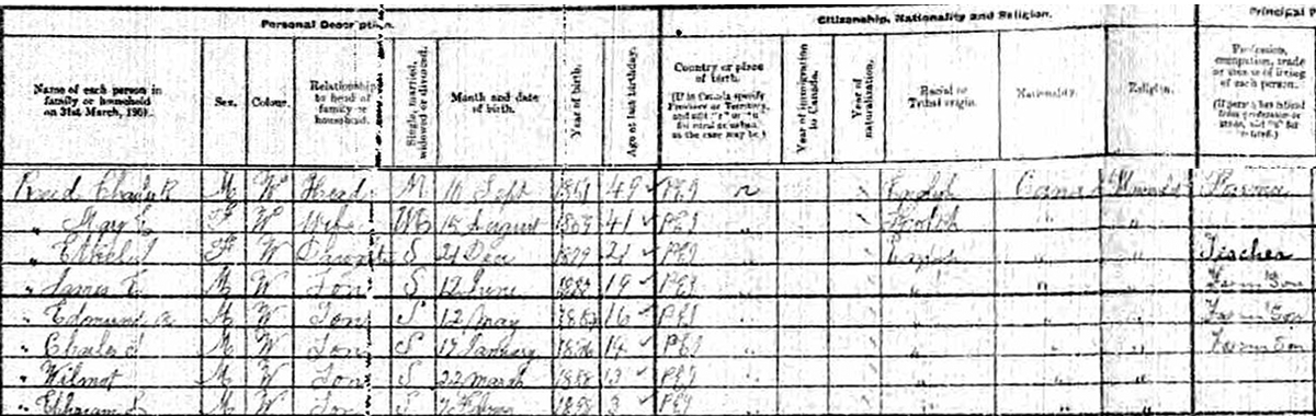 | Witness | He was enumerated on the census in 1901 in the household of Charles R. Read in Lot 9, Prince County, Prince Edward Island, CanadaG. included in the household with Charles (age 49) were his wife Mary Eva (age 41), their children Ethel (age 21), James/Elbert (age 19), Edmond/Edward (age 16), Charles (age 14), Wilmot (age 13) and Ephraim (age 3). Charles was a farmer, Ethel a teacher. James, Edmund and Charles were farmer's sons. The family religion was Universalist.2 1901 Canada Census, Lot 9, Prince County, Prince Edward Island. Household of Charles R. Read, his wife Mary Eva Burns, their children Ethel, Elbert/James, Edmond/Edward, Charles, Wilmot and Ephraim. |