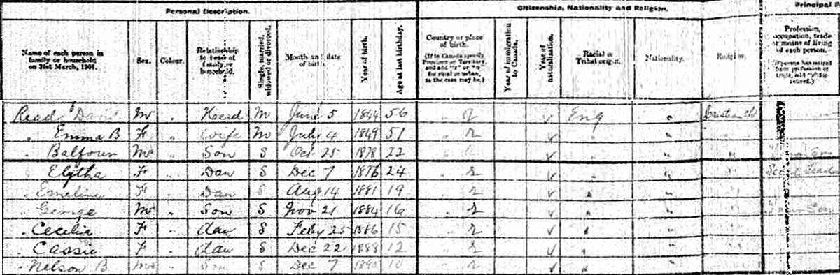 | Wife | She was enumerated on the census in April 1901 in the household of David Purrington Read, as his wife, in Lot 19, Prince County, Prince Edward Island, CanadaG. Enumerated in the household with William were his wife Emeline (entered as Emiline), daughter Dorothy, sons David, Nelson and Edwin, and his aunt Ellen, who had helped raise him. in the household with David (age 56) were his wife Emma Bishop (age 51), children Balfour (age 22), Elytha (age 24), Emeline (age 19), George (age 16), Cecelia (age 15), Cassie (age 12) and Nelson (age 10). David was a farmer, Balfour and George were farmer's sons, Elytha a school teacher.5 1901 Canada Census, Lot 19, Prince County, Prince Edward Island. Household of David Read, his wife Emma Bishop, children Balfour, Elytha, Emeline, George, Cecelia, Cassie and Nelson. |