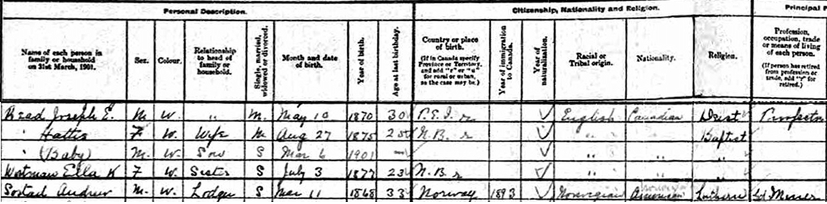 | Census | Joseph Edgar Read was head of the household in the census Between 8 April 1901 and 10 April 1901 in Nelson, British Columbia, CanadaG. included in the household with Joseph (age 30) were his wife Hattie (age 25), their son (no name) Baby (1 month), Hattie's sister Ella (age 23) and a lodger. Joseph was a prospector. Joseph's religion was Deist, everyone else in the household were Baptists.4 1901 Canada Census, Nelson, British Columbia. Household of Joseph Edgar Read, his wife Hattie, their unnamed newborn, and Hattie's sister Ella. |