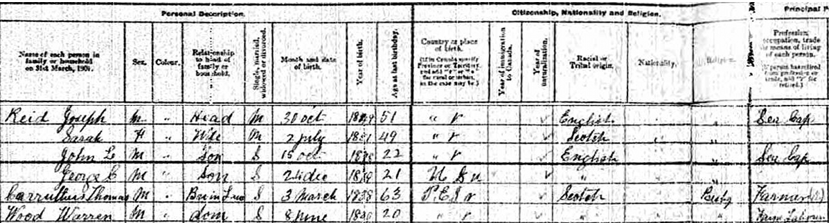 - [S6255] 1901 Microfilm, Library & Archives Canada; 395 Wellington St., Ottawa,, Ontario, Canada, Lot 19, Prince County, Prince Edward Island, Library & Archives Canada Page 1, Family #10.