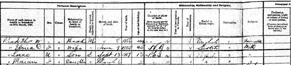| Witness | Lorne Hiram Read was enumerated on the census in 1901 in the household of Thomas Whittemore Read in Summerside, Prince County, Prince Edward Island, CanadaG. included in the household with Thomas Whittemore (age 44) were his wife Elvira Davidson (age 45), their children, Lorne (age 13) and Marion (age 2). His occupation was recorded as Master Mariner (ship's captain). The family religion was Universalist.3 1901 Canada Census, Summerside, Prince County, Prince Edward Island. Household of Thomas Whittemore Read, his wife Elvira Davidson and their children, Lorne and Marion. |