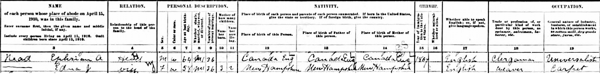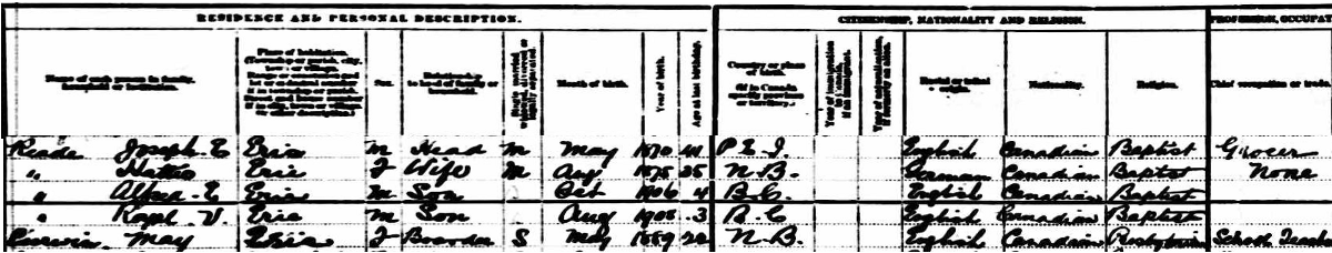 | Census | He was head of the household in the census on 22 June 1911 in Erie, British Columbia, CanadaG. included in the household with Joseph (age 41) were his wife Hattie Wortman (age 35), their sons Alfred (age 4) and Royal (age 3), and an unrelated boarder named May Curwin (age 22), a school teacher. Joseph was a grocer. The family religion was Baptist.5 1911 Canada Census, Erie, British Columbia. Household of Joseph Edgar Read, his wife Harriet 'Hattie' Wortman, their sons Alfred and Royal, and an unrelated boarder. |