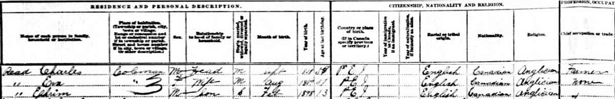 | Witness | Ephraim L. Read was enumerated on the census in 1911 in the household of Charles R. Read in Coleman, Prince County, Prince Edward Island, CanadaG. included in the household with Charles (age 59) were his wife Mary Eva (age 51), and their son Ephraim (age 13). Charles was a farmer. The family religion was Anglican.3 1911 Canada Census, Coleman, Prince County, Prince Edward Island. Household of Charles R. Read, his wife Mary Eva Burns and their son Ephraim. |