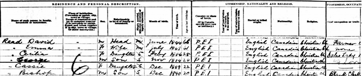 | Wife | She was enumerated on the census in 1911 in the household of David Purrington Read, as his wife, in Lot 19, Wilmot, Prince County, Prince Edward Island, CanadaG. included in the household with David (age 65) were his wife Emma Bishop (age 61), children George (age 26), Cecelia (age 25), Cassie (age 22) and Bishop (age 20). David was a farmer, George was a farmer's son, Cecelia a sales lady in a dry goods store, and Bishop a bank clerk.6 1911 Canada Census, Wilmot, Lot 19, Prince County, Prince Edward Island. Household of David Read, his wife Emma Bishop, children George, Cecelia, Cassie and Bishop. |