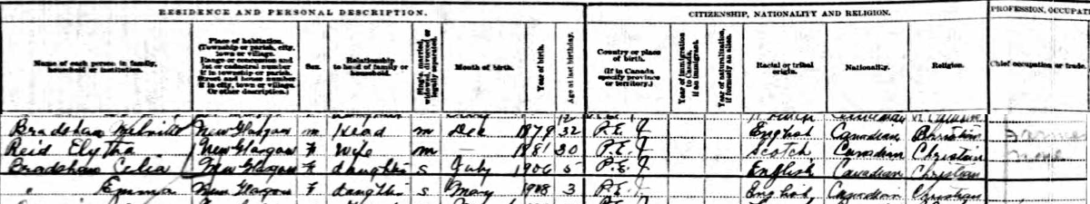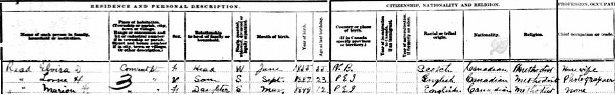 | Census | She was head of the household in the census Between 3 June 1911 and 4 June 1911 in Convent St., Summerside, Prince County, Prince Edward Island, CanadaG. included in the household with Elvira (age 55) were her son Lorne (age 23) and daughter Marion (age 12). Lorne was a photographer. The family religion was Methodist.5 1911 Canada Census, Summerside, Prince County, Prince Edward Island. Household of widow Elvira (Davidson) Read, her son Lorne and daughter Marion. |