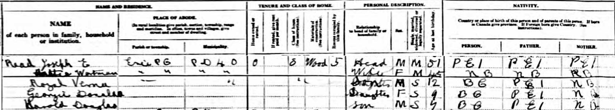 - [S11356] 1921 Canada Census, Summerside, Prince County, Prince Edward Island, Household of Lorne Read, digital copy of original document, Library & Archives Canada, Reference Number RG 31, Folder Number 104, Census Place: Drill Shed, Summerside, Prince County, Prince Edward Island, Page Number 14. Library & Archives Canada, Library & Archives Canada; 395 Wellington St., Ottawa,, Ontario, Canada.