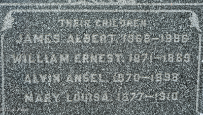 Inscription: Alexander Laird 1830 - 1896 / His Beloved Wife / Rebecca P. Read 1841 - 1882 / LAIRDBack: Their Children / James Albert 1868 - 1886 / William Ernest 1871 - 1889 / Alvin Ansel 1870 - 1898 / Mary Louisa 1877 - 1910.2,3  Cemetery Marker: Alexander Laird (1830-1896), his wife Rebecca P. Read (1841-1882), their children James Albert (1868-1886), William Ernest (1871-1889), Alvin Ansel (1870-1898) and Mary Louisa (1877-1910). Presbyterian/United Cemetery, North Bedeque, Prince County, Prince Edward Island, Canada.  Back inscription detail.