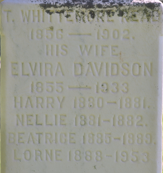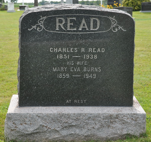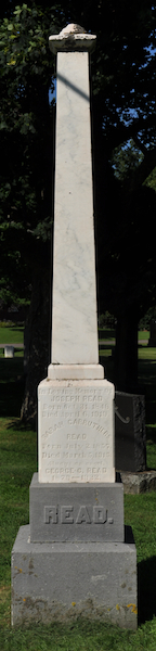 | Burial | He was buried in the Peoples Cemetery, Summerside, Prince County, Prince Edward Island, Canada, 46.40548, -63.77744G. tall square obelisk.Inscription: In Loving Memory of / Joseph Read / Born Oct. 31, 1846 / Died April 6, 1919. / Sarah Carruthers / Read / Born July 2, 1857, / Died March 5, 1915. / Always an angel. / George C. Read / 1879 - 1922. / READLeft: Ephraim Read / Died / at Demerara, S.A. / March 3, 1865: / Aged 53 years. / Also his wife / Rosara Chappell / Died Aug. 4, 1883: / Aged 73 years. / The world is better for / their having lived in it.Right: In Loving Memory of / David P. Read / Born June 5, 1845 / Died Feb. 8, 1918 / His wife / Emma Bishop / Born July 4, 1849 / Died Sept. 12, 1930 / He giveth his beloved / sleep. Son / A. Balfour / Drowned 1910 Aged 31. / Columbia River, B.C.Back: T. Whittemore Read / 1856 - 1902. / His Wife / Elvira Davidson / 1855 - 1933 / Harry 1880 - 1881. / Nellie 1881 - 1882. / Beatrice 1885 - 1889. / Lorne 1888 - 1953.Footstones: Father Mother.Lorne and his wife have their own tombstone as well (the coordinates are for this stone). Inscription: READ / Lorne H. Read / 1888 - 1953 / His Wife / Delia Brown / 1891 - 1987.5,7 Tombstone, Joseph Read (1849-1919), his wife Sarah Jane Carruthers (1857-1915), his father Ephraim (1812-1865), his mother Rosara Chappell (1811-1884), Joseph's brother David P. Read (1845-1918), his wife Emma Bishop (1849-1930), their son A. Balfour (1879-1910), Joseph's brother Thomas Whittemore Read (1856-1902), his wife Elvira Davidson (1855-1933), their children Harry (1880-1881), Nellie (1881-1882), Beatrice (1885-1889) and Lorne (1888-1953). Peoples Cemetery, Summerside, Prince County, Prince Edward Island, Canada.  Front inscription detail.  Left inscription detail.  Right inscription detail.  Back inscription detail.  Tombstone, Lorne Hiram Read (1888-1953), his wife Delia Brown (1891-1987). Peoples Cemetery, Summerside, Prince County, Prince Edward Island, Canada. |