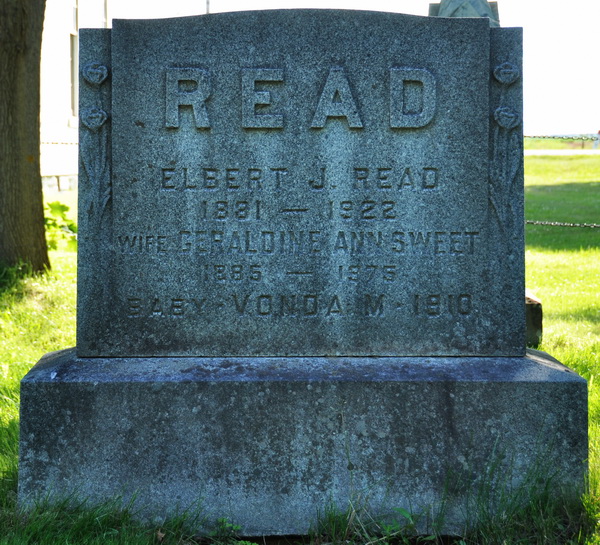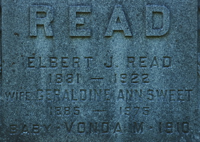 | Burial | She was buried in the United Church Cemetery, Cascumpec, Prince County, Prince Edward Island, Canada, 46.76357, -64.10790G. stone #34.Inscription: READ / Elbert J. Read / 1881 - 1922 / wife Geraldine Ann Sweet / 1885 - 1975 / Baby Vonda M. 1910.1 Tombstone, Elbert James Read (1882-1923), his wife Geraldine Ann Sweet (1885-1975), their infant daughter Vonda (1910-1910).  Front inscription detail. |