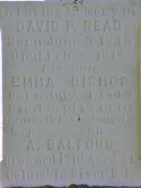 | Wife | Emma Gordon Bishop was enumerated on the census in 1881 in the household of David Purrington Read, as his wife, in Lot 19, Prince County, Prince Edward Island, CanadaG. Enumerated in the household with William were his wife Emeline (entered as Emiline), daughter Dorothy, sons David, Nelson and Edwin, and his aunt Ellen, who had helped raise him. Enumerated in the household with David (age 37) were his wife Emma Bishop (age 29), children Joseph (age 10), Jane (age 7), Elytha (age 5), Balfour (age 2) and Emeline (7 months). David Was a farmer. The family religion was Methodist.2 1881 Canada Census, Lot 19, Prince County, Prince Edward Island. Household of David Read, his wife Emma Bishop, children Joseph, Jane, Elytha, Balfour and Emeline. |