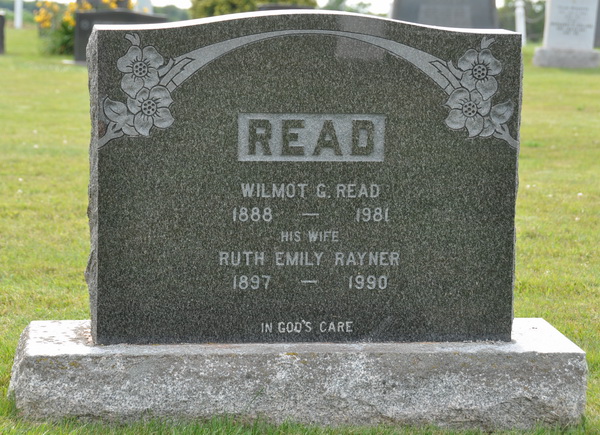 | Burial | She was buried in the Presbyterian/United Cemetery, Brae, Prince County, Prince Edward Island, Canada, 46.66051, -64.19212G. section E, stone 96A. Inscription: READ / Wilmot G. Read / 1888 - 1981 / His wife / Ruth Emily Rayner / 1897 - 1990 / In God's Care. Back: Parents of / Charles James Dorothy Gloria.2 Tombstone, Wilmot G. Read (1888-1981) & Ruth Emily Rayner (1897-1990). United Church Cemetery, Brae, Prince County, Prince Edward Island.  Back inscription detail. |