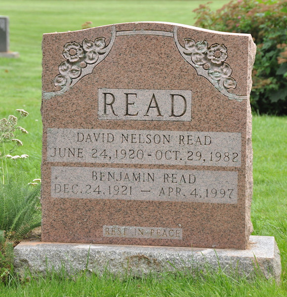| Burial | He was buried in the Peoples Cemetery, Summerside, Prince County, Prince Edward Island, Canada, 46.40539, -63.77554G. Inscription: READ / David Nelson Read / June 24, 1920 - Oct. 29, 1982 / Benjamin Read / Dec. 24, 1921 - Apr. 4, 1997 / Rest in Peace.4![]() Tombstone, David Nelson Read (1920-1982), his brother Benjamin Read (1921-1997). Peoples Cemetery, Summerside, Prince County, Prince Edward Island, Canada. |