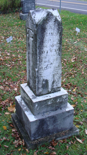 | Burial | She was buried in Sugartown Cemetery; Route 98, Great Valley, Cattaraugus County, New York, USAG. Inscription: Lucinda / Wife of / Elias Bowen / Died / Jan. 9, 1887 / Left: Cary / Son of C.F & O.D. Bowen / Died / Oct. 23, 1874 / Aged 2 yrs., 4 mos., & 6 days (parents of Cary are Clark Bowen & Oliva Butler)Right: Elias Bowen (dates no longer legible.)11 ![]() Tombstone, Elias Bowen Jr. (1818-1903), his wife Lucinda Clark (1818-1887), grandson Cary (1872-1874). Sugartown Cemetery, Great Valley, Cattaraugus County, New York. ![]() Left inscription detail, Carey Bowen. ![]() Tombstone, Elias Bowen Sr. Sugartown Cemetery, Cattaraugus County, New York. |