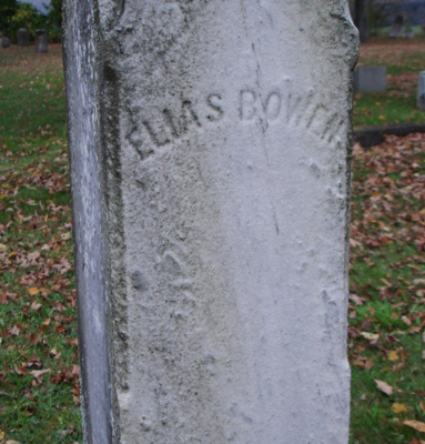 | Burial | He was buried in East Otto Cemetery, East Otto, Cattaraugus County, New York, USAG. Inscription: Elias Bowen / Died / Oct. 6, 1872 / Aged / [remainder of marker is broken away and missing.].2 ![]() Broken tombstone lying on top of the broken marker of his wife, in turn on top of their son Jesse, Elias Bowen Sr. (1798-1862). East Otto Cemetery, Cattaraugus County, New York. Photo courtesy of Jean Onasch. |