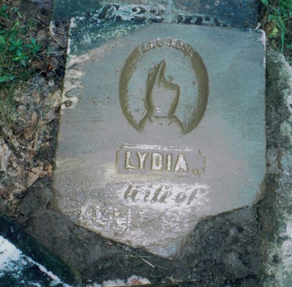 | Burial | She was buried in East Otto Cemetery, East Otto, Cattaraugus County, New York, USAG. Inscription: Lydia, / wife of / [remainder of marker is broken away and missing.].9 ![]() Broken tombstone of Lydia Wellington (1799-1861) lying beneath the broken marker of her husband, in turn on top of their son Jesse. East Otto Cemetery, Cattaraugus County, New York. Photo courtesy of Jean Onasch. |