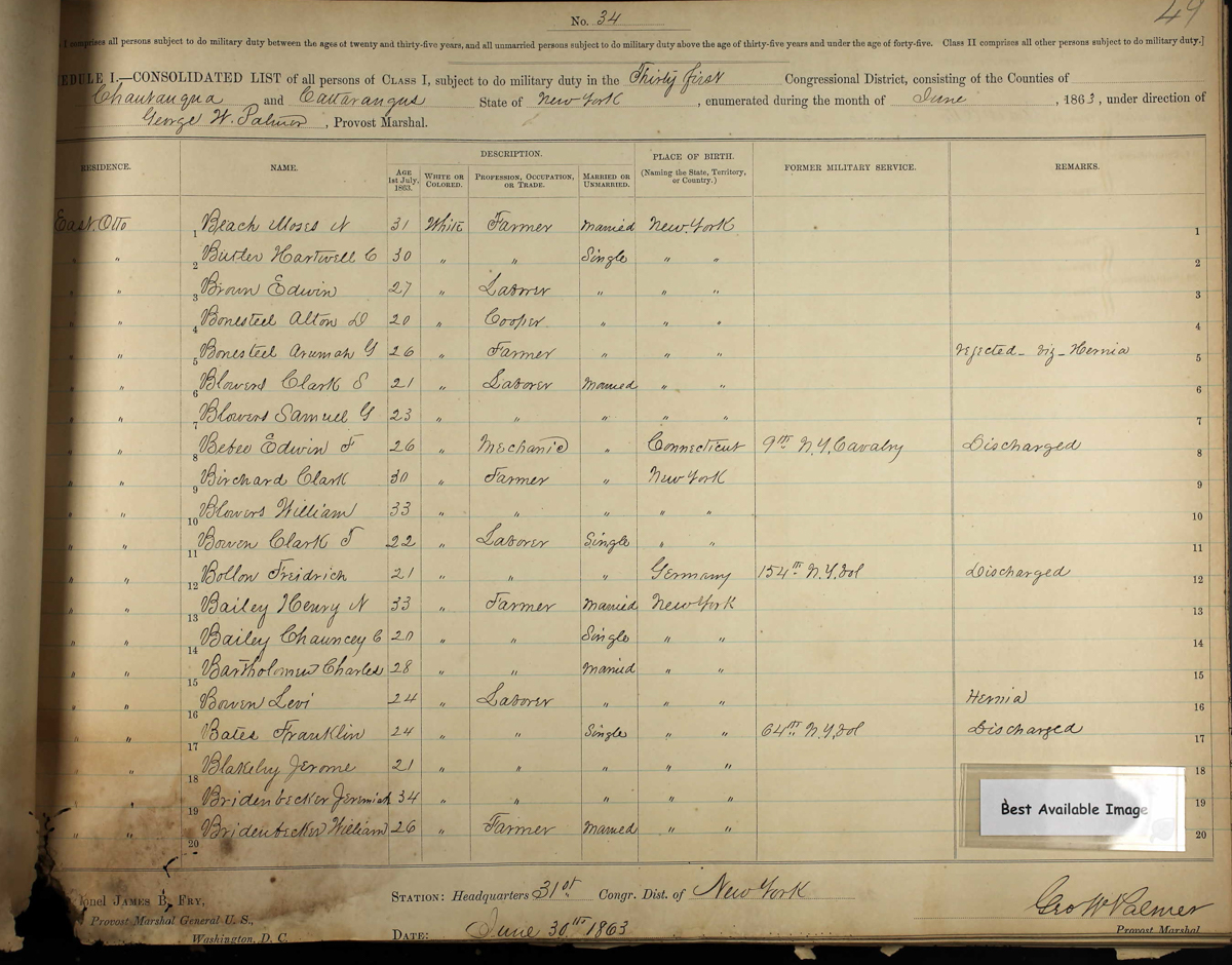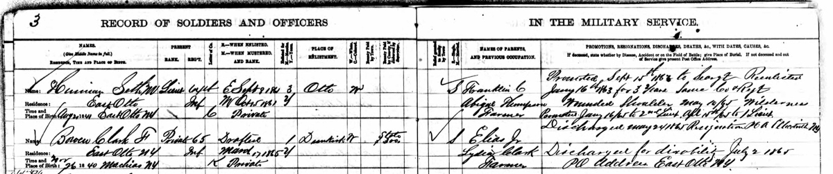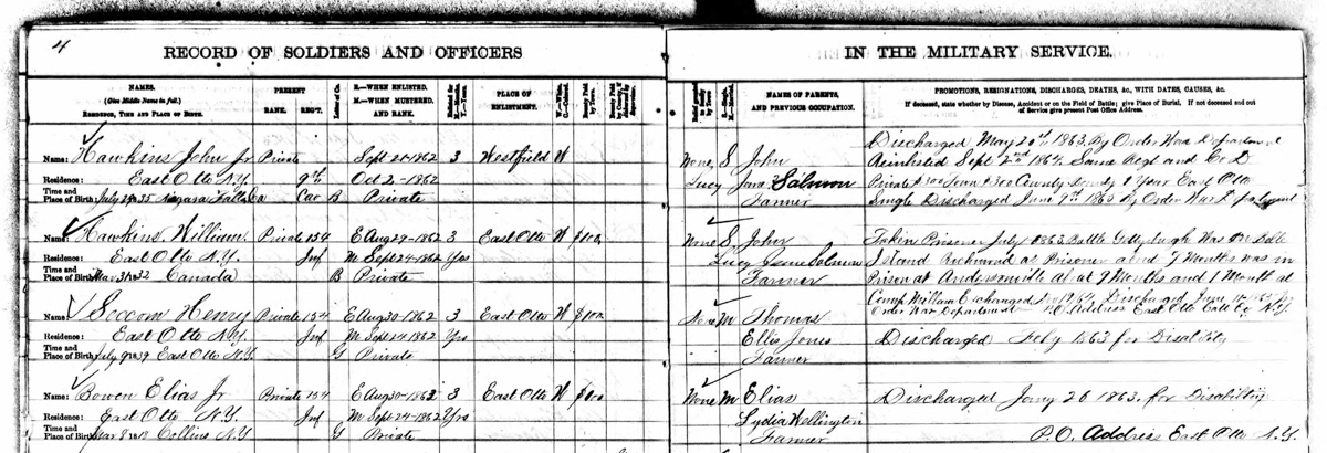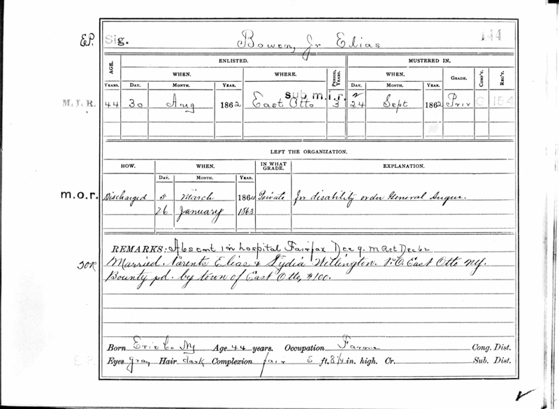 | Milit-Discharged | He was discharged on 26 January 1863 it was recorded that Elias was discharged for disability. P.O. address was East Otto, New York.8,1 |