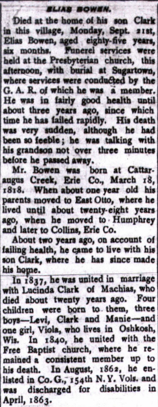 | Death | He died on 21 September 1903 in the home of his son Clark, Ellicottville, Cattaraugus County, New YorkG. Obituary: "ELIAS BOWEN. Died at the home of his son Clark in this village, Monday Sep 21st, Elias BOWEN, aged 85 years, 6 months. Funeral services were held at the Presbyterian church this afternoon w/burial at Sugartown where services were conducted by the GAR of which he was a member. He was in fairly good health until about 3 years ago since which time he has failed rapidly. His death was very sudden although he had been so feeble;he was talking with his grandson not over 3 minutes before he passed away. Mr. BOWEN was born at Cattaraugus Creek,Erie Co, March 18, 1818. When about 1 year old his parents moved to East Otto where he lived until about 28 years ago when he moved to Humphrey & later to Collins,Erie Co. About 2 years ago on account of failing health he came to live w/his son Clark where he has since made his home. In 1837 he was united in marriage with Lucinda CLARK of Machias who died about 20 years ago. 4 children were born to them-3 boys-Levi, Clark & Manie-&1 girl Viola who lives in Oshkosh WI. In 1840 he united with the Free Baptist church, where he remained a consistent member up to his death. In Aug 1862 he enlisted in Co G 154th NY Vols- dicharged for disabilities Apr 1863."3![]() Obituary, Elias Bowen Jr., The Post, Ellicottville, New York, published Wednesday 23 September 1903. |
