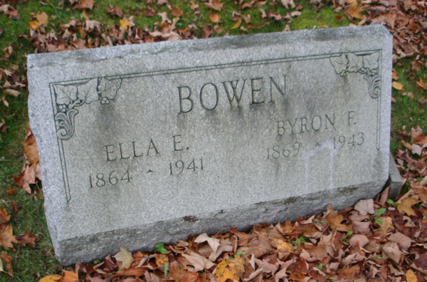 Inscription: BOWEN / Ella E. / 1864 - 1941 | Byron F. / 1869 - 1943.1  Tombstone, Byron F. Bowen (1869-1943), his wife Ella E. (1864-1941). Sugartown Cemetery, Cattaraugus County, New York.
