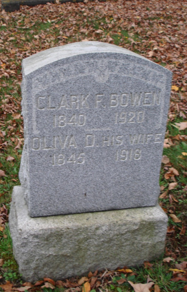 Inscription: Clark F. Bowen / 1840 - 1920 / Oliva D. His Wife / 1845 - 1918.7  Tombstone, Clark F. Bowen (1840-1920), his wife Oliva D. Butler (1845-1918). Sugartown Cemetery, Cattaraugus County, New York.