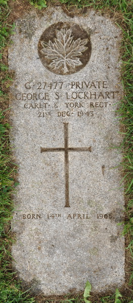 | Burial | He was buried on 23 December 1943 in Elmwood Cemetery, Moncton, Westmorland County, New Brunswick, Canada, 46.10919, -64.77597G. Lot 63, Grave #1. Inscription: G.27477b Private / George S. Lockhart / Carlt. & York Regt. / 21st Dec. 1945 / Born 14th April 1905.2,4,5 Tombstone, George Seaman Lockhart (1905-1943). Elmwood Cemetery, Moncton, Westmorland County, New Brunswick, Canada. |