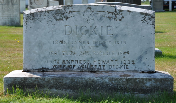| Burial | He was buried in the Free Church of Scotland Cemetery, Cape Traverse, Prince County, Prince Edward Island, Canada, 46.23867, -63.63145G. row 11, stone 54.Inscription: DICKIE / 1848 James Dickie 1919 / His Wife / 1861 Eliza Ann Baglole 1946 / 1901 Empress Howatt 1933 / Wife of Wilbert Dickie.2 Tombstone, James Dickie (1848-1919), his wife Eliza Ann Baglole (1861-1946), Empress Howatt (1901-1933), first wife of their son John Wilbert Dickie. Free Church of Scotland Cemetery, Cape Traverse, Prince County, Prince Edward Island, Canada. |