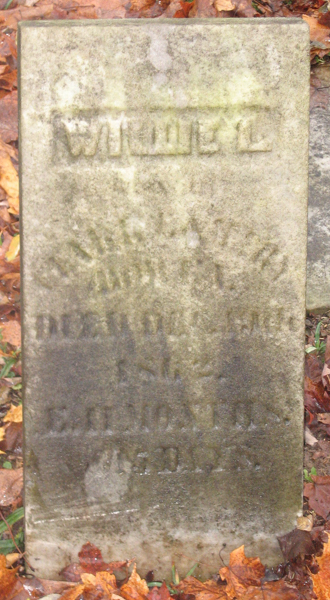 he is buried with his mother. Inscription: Willie L. / son of / Clark F. & Mary / Bowen / Died Dec. 19, / 1862 / E. 11 months / & 15 days.1  Tombstone, Willie L. Bowen (1861-1862). East Otto Cemetery, Cattaraugus County, New York.