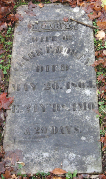 Inscription: Mary / Wife of / Clark F. Bowen / Died / May 26, 1863. / E. 21 Y'rs, 1 Mo / & 29 Days.1  Tombstone, Mary (1842-1863), wife of Clark F. Bowen. East Otto Cemetery, Cattaraugus County, New York.