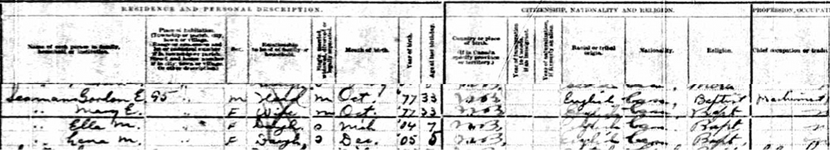 | Witness | She was enumerated on the census in 1911 in the household of Gordon Ernest Seaman in 95 Dominion St., Moncton, Westmorland County, New Brunswick, CanadaG. included in the household with Gordon (age 33) were his wife Mary (age 33), and daughters Ella (age 7) and Lena (age 5).2 1911 Canada Census, Moncton, Westmorland County, New Brunswick. Household of Gordon Ernest Seaman, his wife Mary, their children Ella and Lena. |