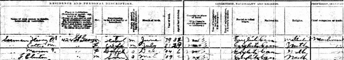 | Witness | He was enumerated on the census in 1911 in the household of Harry Olen Seaman in 424 St. George St., Moncton, Westmorland County, New Brunswick, CanadaG. included in the household with Harry (age 32) were his wife Lottie (age 29), their children Marion (age 6) and Clinton (age 2). Harry was a machinist. The family religion was Methodist.2 1911 Canada Census, Moncton, Westmorland County, New Brunswick. Household of Harry O. Seaman, his wife Lottie Jones, their children Marion & Clinton. |
