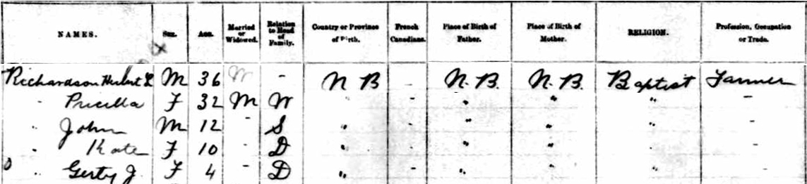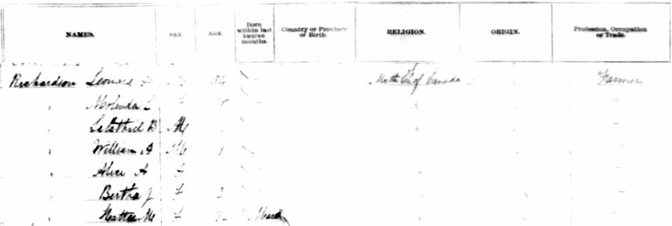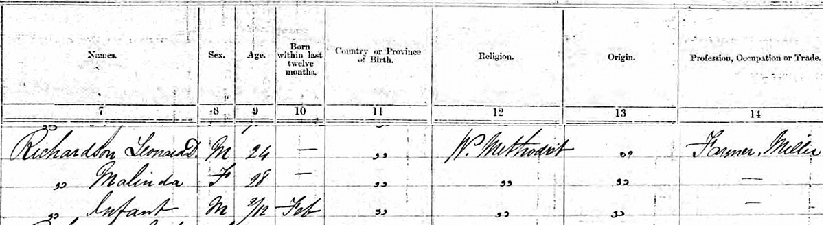 | Witness | He was enumerated on the census in 1871 in the household of Leonard D. Richardson in Westmorland Parish, Westmorland County, New BrunswickG. included in the household with Leonard (age 34) were his wife Melinda Oulton (age 38) and son Salathiel (sp?, age 2 months). Leonard was a farmer. The family religion was Methodist.2 1871 Canada Census, Westmorland Parish, Westmorland County, New Brunswick. Household of Leonard Richardson, his wife Melinda Oulton, their son Salathiel (?). |