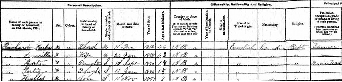 | Witness | He was enumerated on the census on 1 April 1901 in the household of Herbert L. Richardson in Sackville, Westmorland County, New Brunswick, CanadaG. included in the household with Herbert (age 46) were his wife Priscilla Sears (age 42), daughters Kate (age 18) and Gerty (age 15), and son Hallet (age 3). Herbert was a farmer. Kate was a music teacher. The family religion was Baptist.1 1901 Canada Census, Sackville, Westmorland County, Westmorland County, New Brunswick. Household of Herbert Richardson, his wife Priscilla Sears, and their children Kate, Gerty and Hallet. |