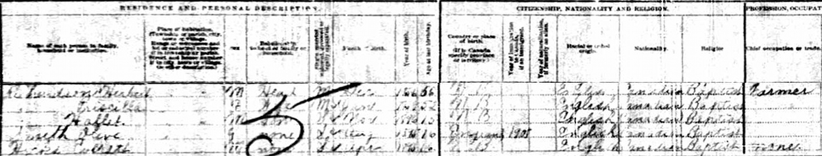 | Witness | Hallet Richardson was enumerated on the census on 1 June 1911 in the household of Herbert L. Richardson in Brooklyn Rd. (near Midgic), Westmorland County, New Brunswick, CanadaG. included in the household with Herbert (age 56) were his wife Priscilla Sears (age 52), and son Hallet (age 15). Herbert was a farmer. The family religion was Baptist.2 1911 Canada Census, Sackville, Westmorland County, Westmorland County, New Brunswick. Household of Herbert Richardson, his wife Priscilla Sears, and their son Hallet. |