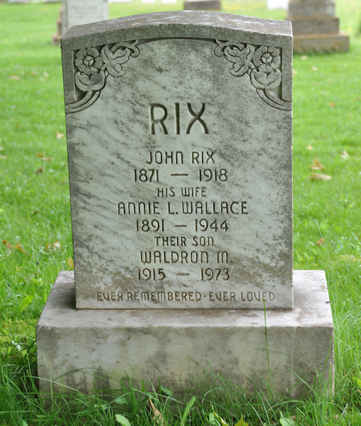 Inscription: RIX / John Rix / 1871 - 1918 / His Wife / Annie L. Wallace / 1891 - 1944 / Their Son / Waldron M. / 1915 - 1973 / Ever Remembered - Ever Loved.2  Tombstone, John Rix (1871-1918), his wife Annie Laura Wallace (1891-1944), their son Waldron (1915-1973). United Church Cemetery, Elmsdale, Prince County, Prince Edward Island, Canada.