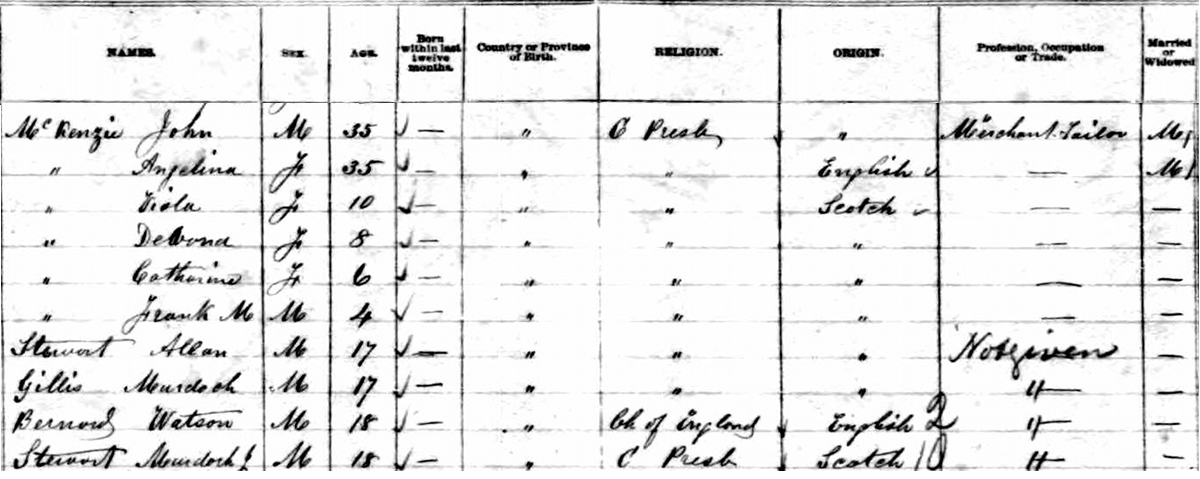 | Census | John MacKenzie was head of the household in the census in 1881 in Summerside, Prince County, Prince Edward Island, CanadaG. included in the household with John (age 35) were his wife Angelina Cannon (age 35), their children Viola (age 10), Devona (age 8), Catherine (age 6) and Frank (age 4), and four unrelated lodgers. John was a merchant tailor. The family religion was Presbyterian.4 1881 Canada Census, Summerside, Prince County, Prince Edward Island. Household of John McKenzie, his wife Angelina Cannon, their children Viola, Devona, Catherine and Frank. Four unrelated lodgers were also in the household. |
