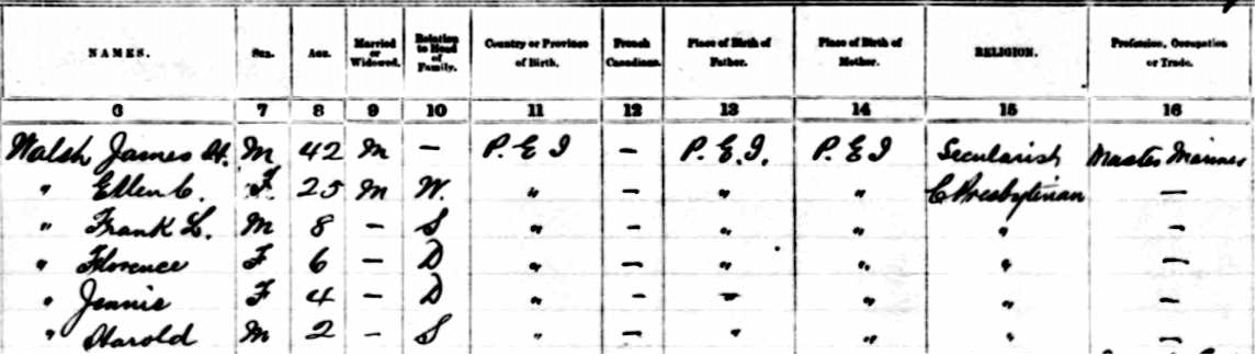 - [S6300] 1911 Canada Census, Summerside, Prince County, Prince Edward Island, household #76 of James H. Walsh, (8 & 9 June, 1911), digital copy of original microfilm document, Page 7, Line 40. Library & Archives Canada, Library & Archives Canada; 395 Wellington St., Ottawa,, Ontario, Canada.