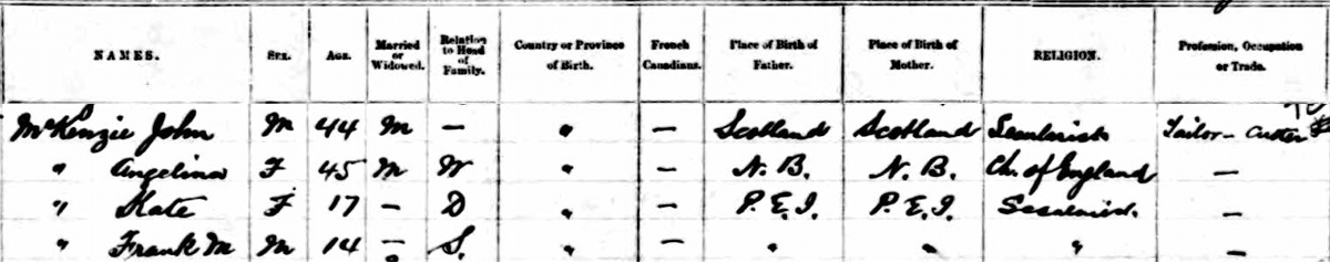 | Census | He was head of the household in the census on 13 April 1891 in Summerside, Prince County, Prince Edward Island, CanadaG. included in the household with John (age 44) were his wife Angelina Cannon (age 45), their children Kate (age 17) and Frank (age 14). John was a tailor-cutter. John and the children were Secularists, Angelina was Anglican.5 1891 Canada Census, Summerside, Prince County, Prince Edward Island. Household of John McKenzie, his wife Angelina Cannon, their children Kate and Frank. |
