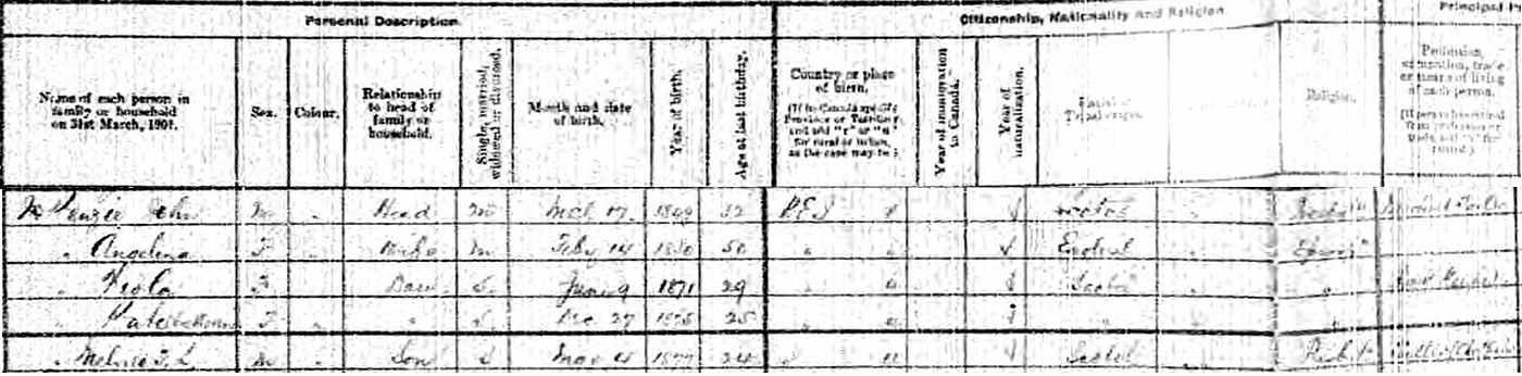 - [S7187] 1901 digital image from microfilm, Library & Archives Canada; 395 Wellington St., Ottawa,, Ontario, Canada, Library & Archives Canada page 4, Family No. 40, John MacKenzie household.