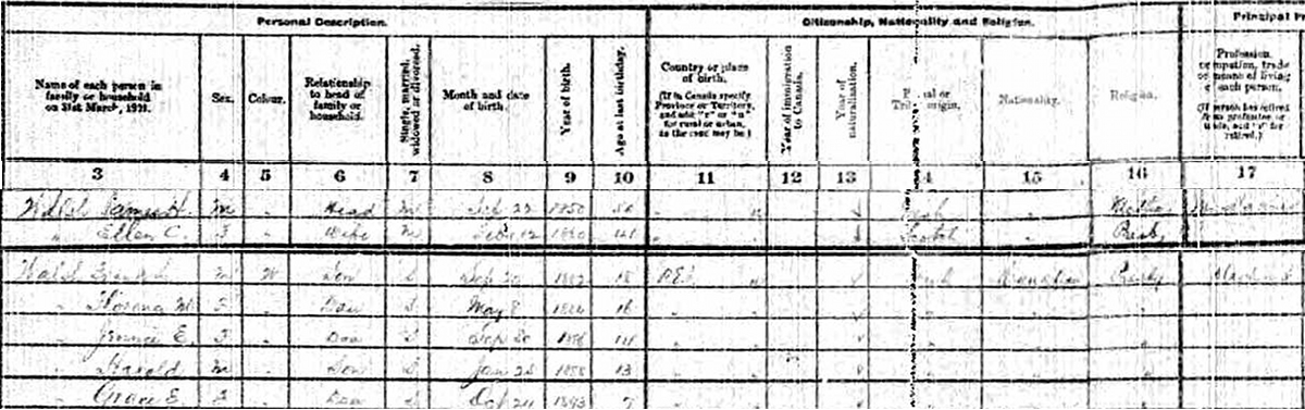 | Son | He was enumerated on the census on 8 June 1911 in the household of Capt. James H. Walsh, as a son, in Spring St., Summerside, Prince County, Prince Edward Island, CanadaG. Enumerated in the household with James (age 62) were his wife Ellen (age 51), children Harold (age 22), John (age 9), Florence (age 26), Jennie (age 24) and Grace (age 18). James was a sail maker, Harold a salesman, Florence a stenographer, Jennie was training to become a nurse and Grace a book keeper. The family religion was Presbyterian.2 1911 Canada Census, Summerside, Prince Edward Island. Household of James H. Walsh, his wife Ellen Charlotte Clay and children Harold, John, Florence, Jennie and Grace. |