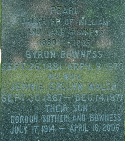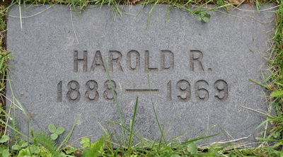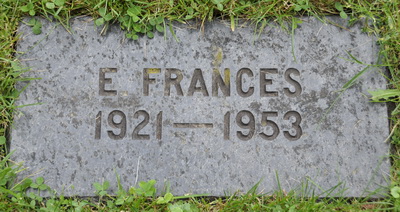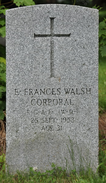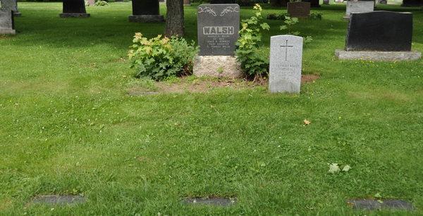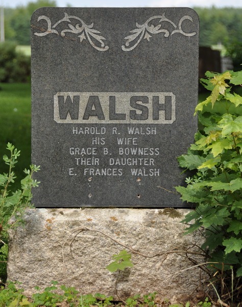 Hal was buried on 2 October 1969 [Obituary, Guardian newspaper, Charlottetown, published 3 October 1969, page 3]Inscription: WALSH / Harold R. Walsh / His Wife / Grace B. Bowness / Their daughter / E. Frances Walsh [no dates]Back: In Loving Memory of / Frank, Harold and John / sons of / Capt. James Walsh & Ellen Clay [no dates]Military marker: E. Frances Walsh / Corporal / R.C.A.F. (W.D.) / 25 Sept. 1953 / Age 31Footstones: E. Frances / 1921 - 1953Grace B. / 1891 - 1974Harold R. / 1888 - 1969.4  Family plot of Harold R. Walsh, his wife Grace Bowness, their daughter Frances Walsh, also Frank, Harold & John, sons of Capt. James Walsh & Ellen Clay (Frank & John are brothers of Harold). Three flatstones are in the foreground.  Tombstone, detail.  Back inscription.  Military marker, E. Frances Walsh (1921 - 1953).  Flatstone, E. Frances Walsh (1921 - 1953), daughter of Harold Walsh & Grace Bowness.  Flatstone, Grace B. Walsh (1891 - 1974).  Flatstone, Harold R. Walsh (1888-1969).