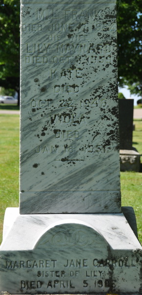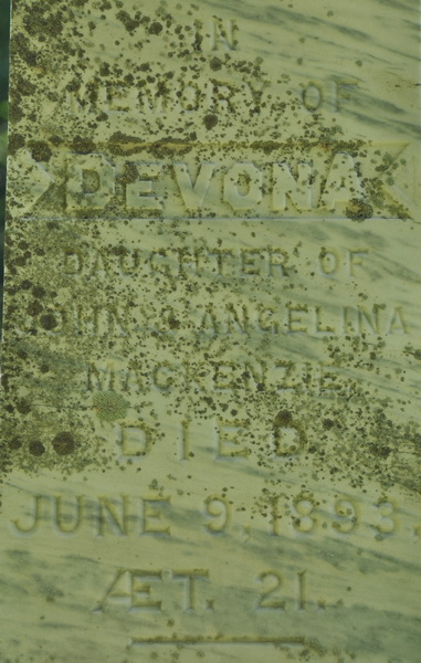 | Burial | He was buried in the Peoples Cemetery, Summerside, Prince County, Prince Edward Island, Canada, 46.40555, -63.77706G. Inscription: In / Memory of / Devona / Daughter of / John & Angelina / MacKenzie / Died / June 9, 1893, / AEt. 21 / MACKENZIE / [script]Left: M. L. Frank / Died June 17, 1954 / His Wife / Lily Maynard / Died Oct. 8, 1959 / Kate / Died / Oct. 22, 1948 / Viola / Died / Jan. 18, 1951 / Margaret Jane Carroll / sister of Lily / Died April 5, 1966 Right: John MacKenzie / Died / June 1, 1903, / AET. 57. / His Wife / Angelina Cannon / Died / Nov. 7, 1933, / AET. 86. Foot stones: Jane, Frank, Devona, Mother, Father, Kate, Viola.1 Tombstone for John MacKenzie (1846-1903), his wife Angelina Cannon (1872-1933), son Frank MacKenzie (1877-1954), his wife Lily Maynard (?-1959), daughters Kate MacKenzie (1875-1948) and Viola MacKenzie (1871-1951), and Margaret Jane Carroll (?-1966), sister of Lily Maynard. Peoples Cemetery, Summerside, Prince County, Prince Edward Island, Canada.  Front inscription detail.  Left inscription detail.  Right inscription detail. |