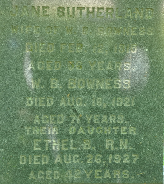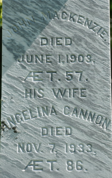 - [S7186] Cemetery marker. John MacKenzie & Angelina Cannon, inscription; read by David A. Walker, 12 July 2012.