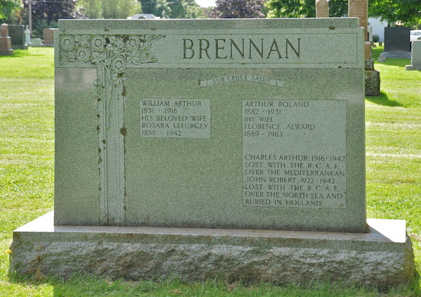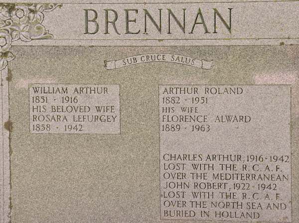 | Burial | He was buried in the Peoples Cemetery, Summerside, Prince County, Prince Edward Island, Canada, 46.40506, -63.77620G. Inscription: BRENNAN / William Arthur / 1851 - 1916 / His Belovd Wife / Rosara Lefurgey / 1858 - 1942 | Arthur Roland / 1882 - 1951 / His Wife / Florence Alward / 1889 - 1963 / Charles Arthur 1916 - 1942 / Lost with the R. C. A. F. / Over the Mediterranean / John Robert / 1922 - 1942 / Lost with the R. C. A. F. / Over the North Sea and / Buried in HollandBack: Constance Horner / 1921 - 2002 / Her Husband / William Roland / 1914 - 2005Front footstones: William Arthur, Rosara Lefurgey, Arthur Roland, Florence AlwardBack footstones: William Roland, Constance Horner.1 Tombstone, William Arthur Brennan (1851-1916), his wife Rosara Lefurgey (1858-1942), their son Arthur Roland Brennan (1882-1951), his wife Florence Alward (1889-1963), their sons Charles Arthur (1916-1942), John Robert (1922-1942), William Roland Brennan (1914-2005), his wife Constance Horner (1921-2002). Peoples Cemetery, Summerside, Prince County, Prince Edward Island, Canada.  Front inscription detail.  Back inscription detail. |