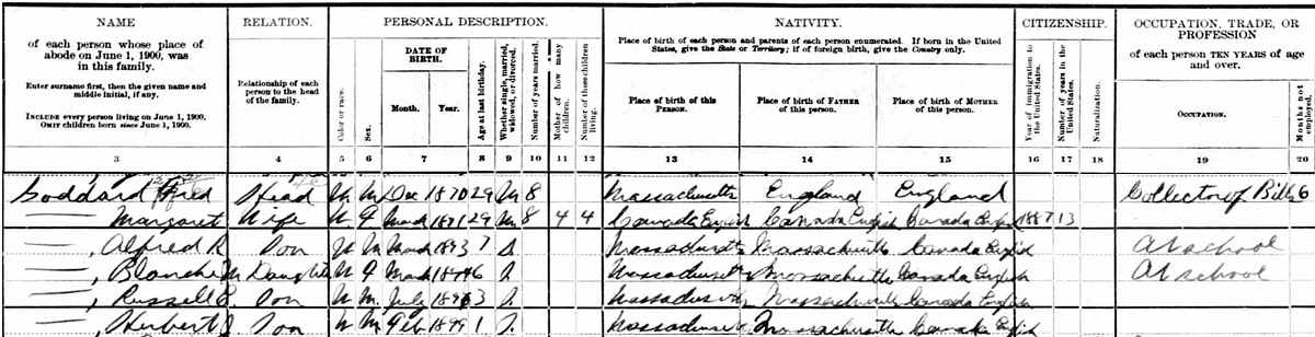 | Census | Frederick Goddard was head of the household in the census on 5 June 1900 in Chelsea, Suffolk County, Massachusetts, USAG. included in the household with Fred (age 29) were his wife Margaret Trenholm (age 29), children Alfred (age 7), Blanche (age 6), Russell (age 3) and Herbert (age 1). Fred was a "collector of bills". Alfred and Blanche were "at school".1 1900 US Census, Chelsea, Suffolk County, Massachusetts. Household of Fred Goddard, his wife Margaret Trenholm, their children Alfred, Blanche, Russell and Herbert. |