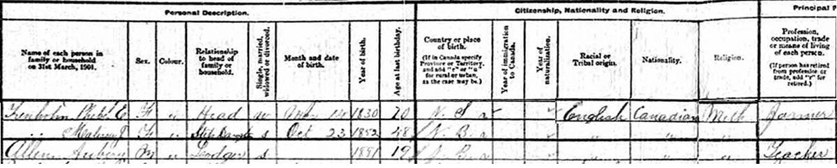 | Census | She was head of the household in the census in 1901 in Botsford Parish, Westmorland County, New Brunswick, CanadaG. included in the household with widowed Phebe (age 70) was her step-daughter Melissa (age 48), daughter of Phoebe's husband Robert Trenholm by his first marriage, and Aubrey Allen, a boarder. Phebe was still farming. The family religion was Methodist.4 1901 Canada Census, Botsford, Westmorland County, New Brunswick. Household of widow Phebe E. Trenholm, her step-daughter Melissa and an unrelated lodger. |
