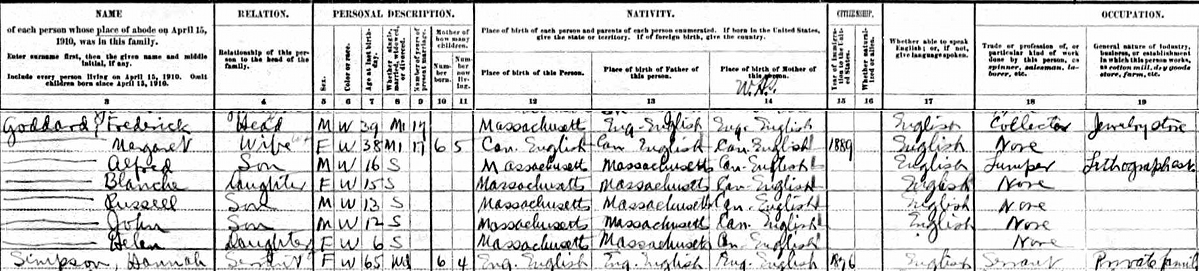 | Census | He was head of the household in the census on 22 April 1910 in Revere, Suffolk County, Massachusetts, USAG. included in the household with Frederick(age 39) were his wife Margaret Trenholm (age 38), children Alfred (age 16), Blanche (age 15), Russell (age 13), Herbert (age 12) and Helen (age 6). Fred was a bill collector for a jewellery store. Alfred was a lumper for a lithographic establishment. Also in the household was widowed Hannah Simpson, a servant (age 65).2 1910 US Census, Revere, Suffolk County, Massachusetts. Household of Frederick Goddard, his wife Margaret Trenholm, their children Alfred, Blanche, Russell, John & Helen, as well as a servant, Hannah Simpson. |